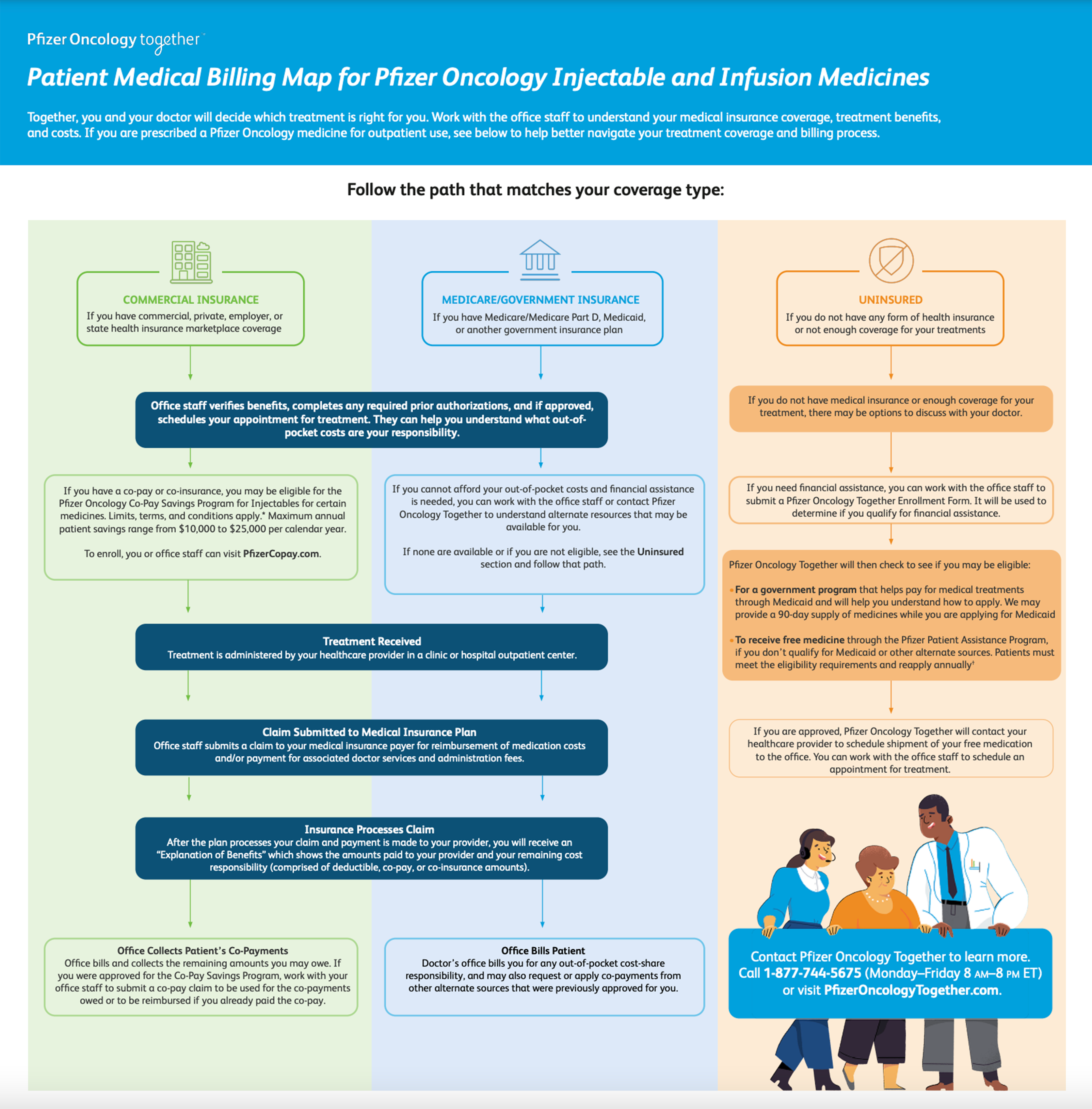 OBTENER EL MEDICAMENTO RECETADO DE PFIZER ONCOLOGYDespués de que le hayan recetado un medicamento de Pfizer Oncology, usted y su profesional de atención médica pueden analizar juntos las opciones de ayuda económica que pueden ayudarlo a cubrir el costo de su tratamiento.